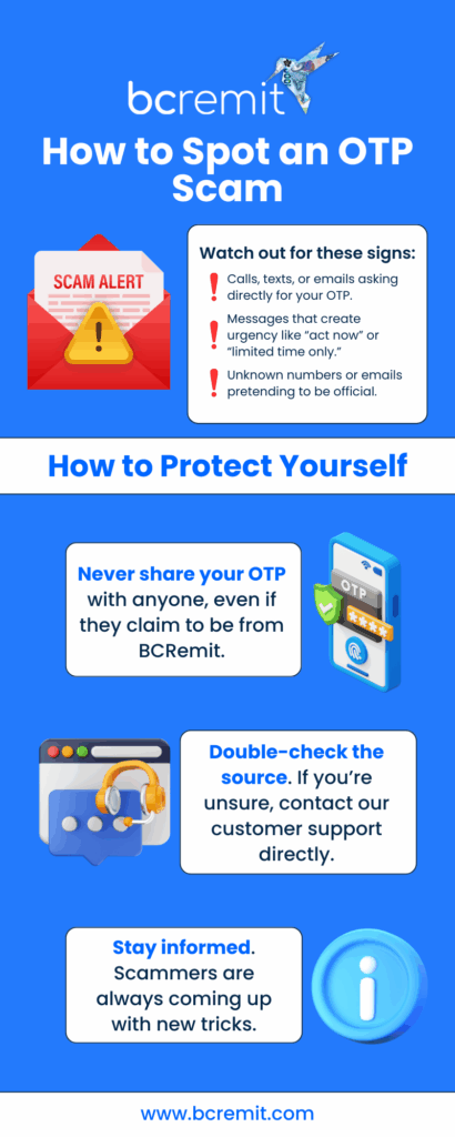 Here’s the truth—BCRemit or any other legitimate company will never ask you for your OTP.